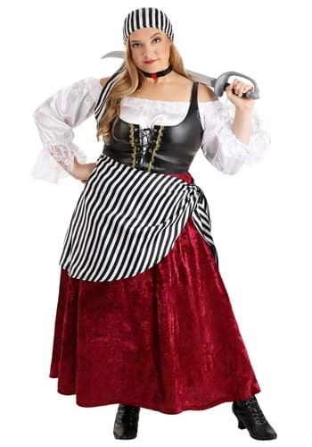 It is your shift, lass, and how better to keep these rugged pirates under thumb than in this Deluxe Pirate Wench costume!? In this polyester satin, crushed velvet, faux leather, and tulle garb, you’ll have the perfect combination of clothing to keep those jolly Rogers at full attention. Peasant neckline and puffy sleeves combine to make an innocent looking white bodice but the red velvet skirt and leather vest with gold ribbon contrasts to give you just enough kindly and plenty enough rugged! Finish off the look with the black and white striped satin sash and bandana and matching black choker, if you feel the need, add a cutlass or tricorn hat and you’ll not only be commanding the pirate cove but might earn your own ship!