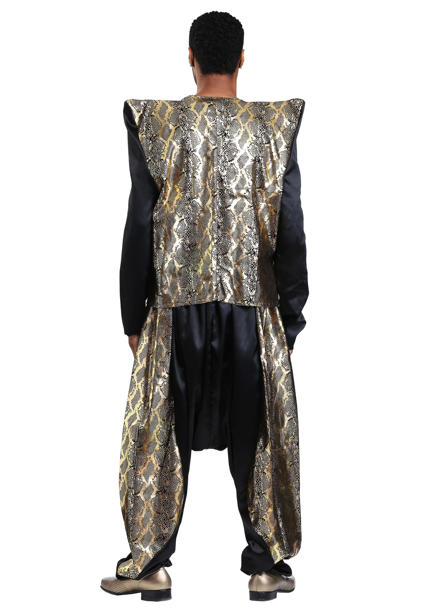 If you can provide the mic skills and the dance moves, then we can help you out with the outfit. This Pop Star costume is a plus size outfit that will have you ready to bust a move on the stage you see. It comes with a black jacket with some sick shoulder pads and plenty of glimmering gold accents. The pants have an elastic band for fitting and feature the same glimmering gold accents on the fronts. Finally, the gold suspenders help tie the whole outfit together! Pair it up with your best pair of shoes and your favorite pair of sunglasses to really step into the role of a 90s rap legend.
