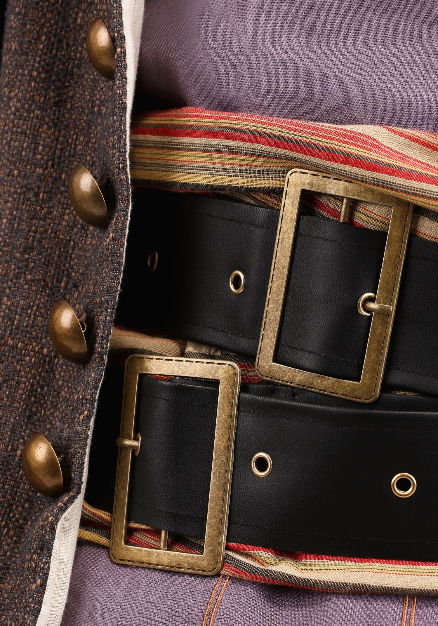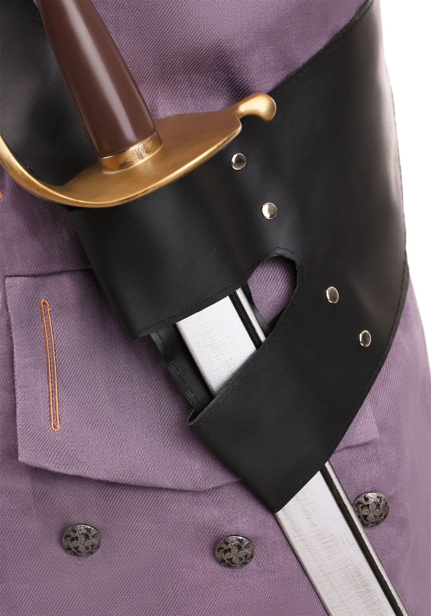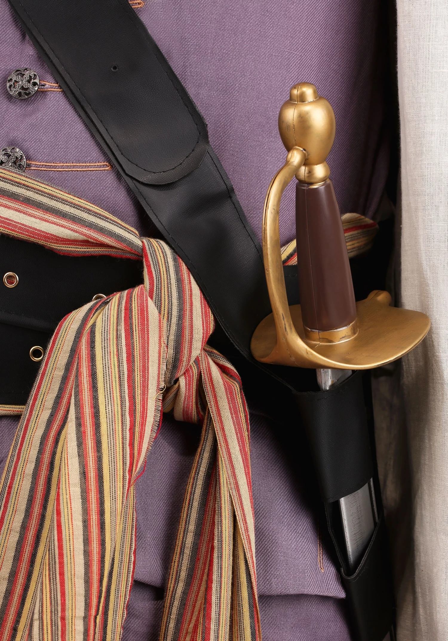 This costume is the true king of all pirate costumes. Just like a real pirate outfit from the time, this costume comes with multiple pieces, including a shirt, jacket, pair of pants, sashes, and belts. The shirt is a simple, loose-fitting cotton-poly blend shirt with cord ties at the neck. The pants have a cropped style with a button fly front with a drop panel. It even has functional pockets that would be the envy of any pirate on the high seas. The jacket has ornate, gold-colored buttons in front and functional pockets with flaps in front. The costume also comes with faux leather belts and a scabbard slot, which you can use to hold a toy sword.